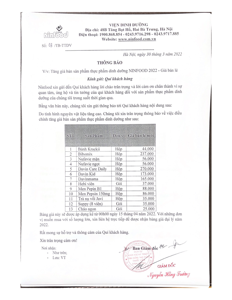 Do tình hình nguyên vật liệu tăng cao. Ninfood xin trân trọng thông báo về việc điều chỉnh tăng giá bán sản phẩm thực phẩm dinh dưỡng. Bảng giá này sẽ được áp dụng kể từ 00h00 ngày 15 tháng 04 năm 2022.