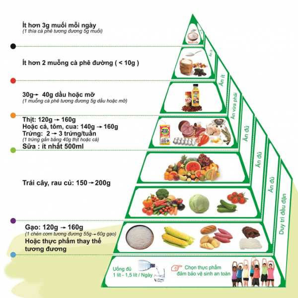 Đáy tháp là những thực phẩm cần bổ sung đầy đủ cho trẻ, càng lên cao đỉnh tháp, hàm lượng các chất dinh dưỡng càng giảm dần nên mẹ hạn chỉ cho trẻ ăn một lượng nhỏ nhóm thực phẩm này.