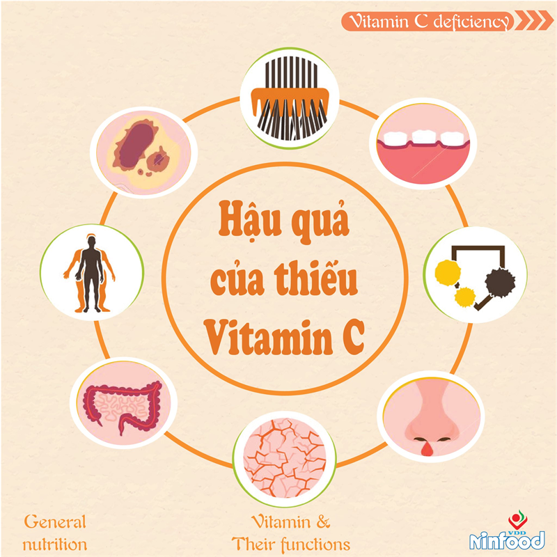 Do vitamin C phân bố rộng rãi trong tự nhiên, nên việc thiếu vitamin C thường khó gặp nếu ăn uống hợp lý và không bị stress. Tuy nhiên, khi thiếu vitamin C lâu ngày sẽ dẫn đến bệnh Scorbut với các triệu chứng chảy máu dưới da, trong mô xương, trong khớp, viêm lợi răng dẫn đến rụng răng từ từ, đau dữ dội khớp, thiếu máu, mệt mỏi, cốt hóa xương ở trẻ em.