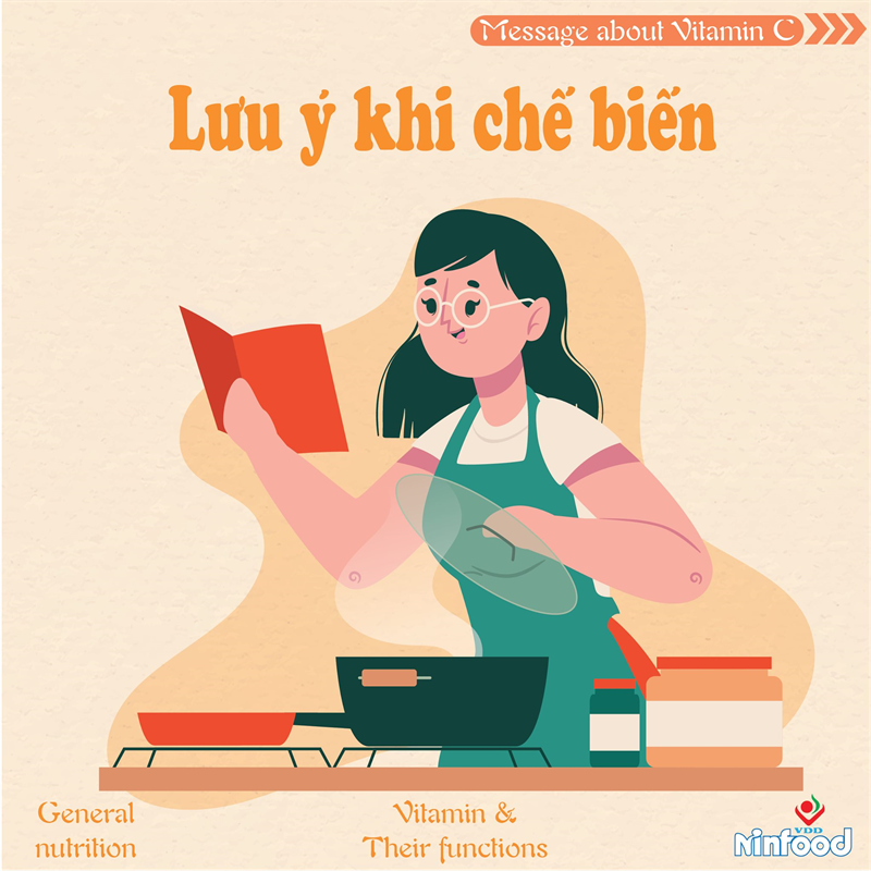 -Khi nấu thức ăn, vitamin C trong thực phẩm bị chuyển hoá nhanh, nấu càng lâu thì vitamin C bị chuyển hoá càng nhiều. Do vậy, để tránh hao hụt vitamin C, chúng ta cần chọn các loại thực phẩm tươi, không bị bầm dập. Nên chọn hoặc gọt vỏ rồi rửa nguyên cả lá, củ, quả xong mới thái. Sau khi thái xong thì nấu ngay và ăn ngay. Nếu phải bảo quản rau quả tươi, cần để trong ngăn mát của tủ lạnh hoặc nơi tối, mát.