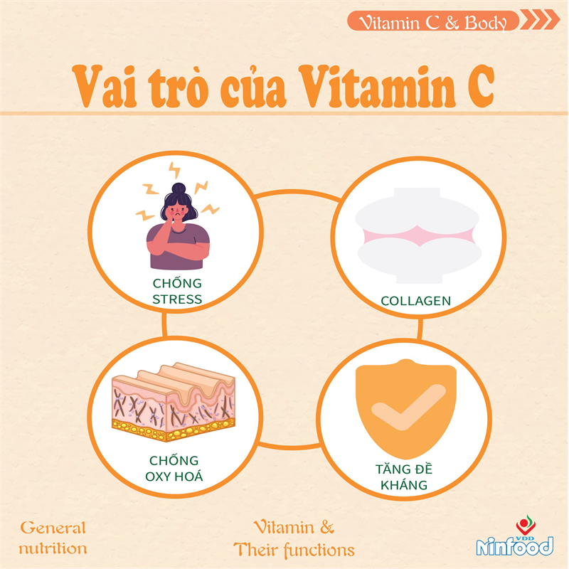 Vitamin C đóng yếu tố hỡ trợ quan trọng trong rất nhiều hoạt động hàng ngày của cơ thể. Các vai trò được nhắc đến nhiều nhất của vitamin C là: