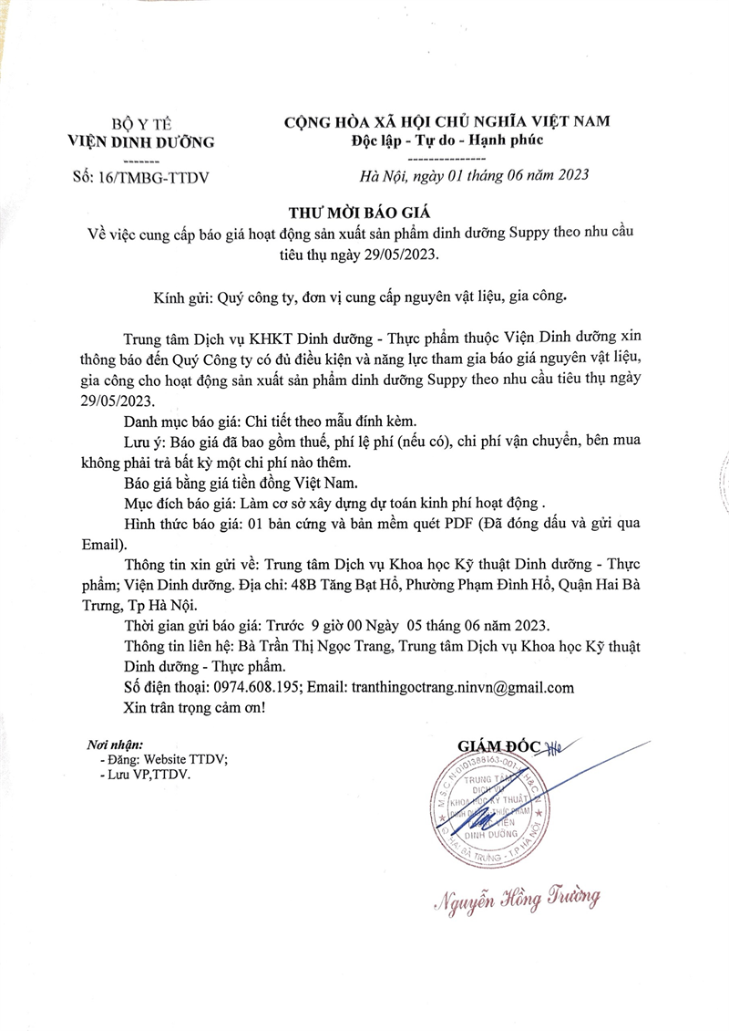 Thư mời báo giá hoạt động sản xuất sản phẩm dinh dưỡng Suppy